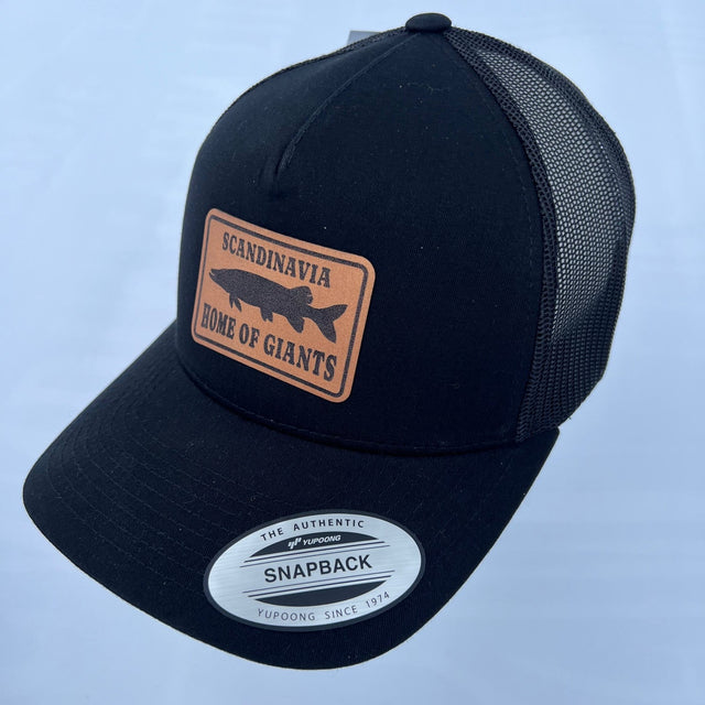 Flexfit snapback trucker keps med patch i PU-läder med gädda & text "Scandinavia - Home of Giants"